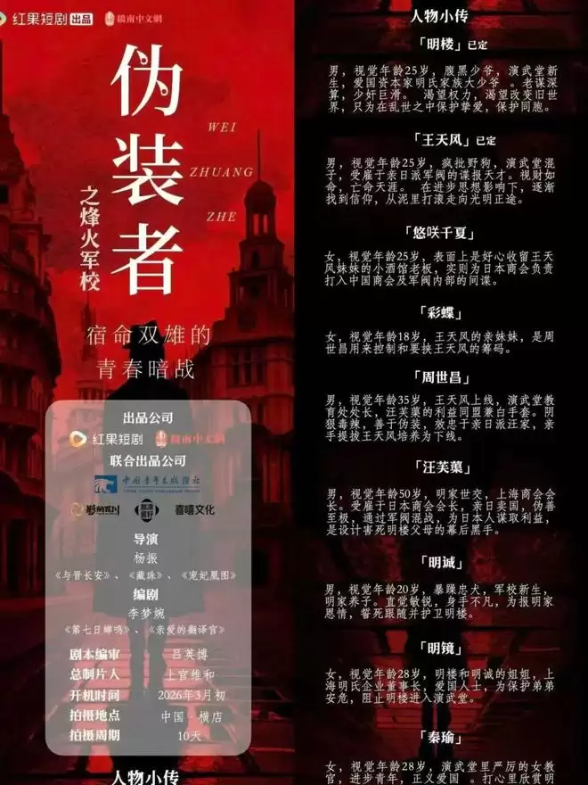 一部名为《伪装者之烽火军校》的短剧正在紧张筹备中。从曝光信息来看,该剧由红果和桥南中文网联合出品,导演是杨振,编剧为李梦婉,拍摄周期预计10天左右。