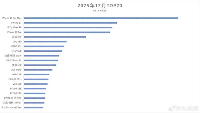 不信的话,可以看看国内的单品销量榜。通常情况下,如果不是有特殊爆款,榜单前三名基本都被iPhone包揽。今天我们就来分析一下2025年12月的国内单品销量Top20。数据来源于行业观察人士“RD观测”,根据他提供的信息,12月份销量前十的机型分别是:iPhone 17 Pro Max、iPhone 17、华为Mate 80、iPhone 17 Pro、荣耀X70、vivo Y50、OPPO A5x、vivo Y500、荣耀畅玩60/m、OPPO Reno15、荣耀500、vivo Y300i、OPPO A6、Hi畅享80、vivo S50、REDMI 15R、REDMI K90、OPPO A5活力版、荣耀畅玩70 Plus、REDMI Note15 Pro。