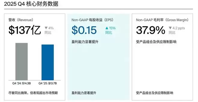 营收:四季度营收136.7亿美元,同比下降4.1%,分析师预期134.3亿美元,英特尔指引为128亿至138亿美元,三季度同比增长3%。