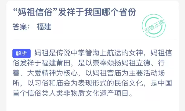 “妈祖信俗”起源于我国哪个省份?这是蚂蚁新村今天发布的每日一题,题目已在2026年1月22日公布。坚持答题,积累木兰币,就能加速你的小镇建设。答对本题,即可立即享受“产速+3/时”的加速奖励!今天这道题的正确答案是【福建】。妈祖信俗发源于福建莆田,其核心精神在于崇奉颂扬妈祖立德、行善、大爱的品格。