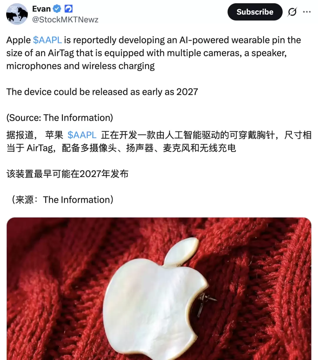 苹果目前正在研发一款由 AI 驱动、可佩戴于胸前的“Pin”设备,不过这款产品仍处于早期开发阶段,最快可能也要等到 2027 年才能问世。