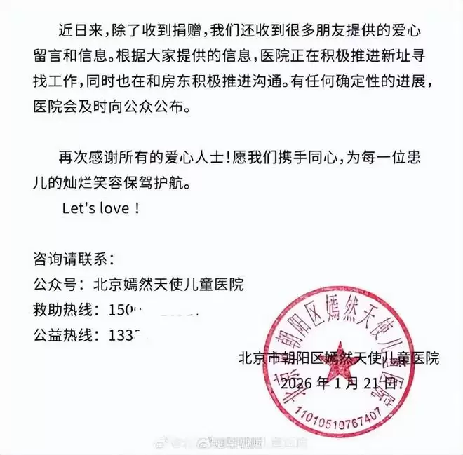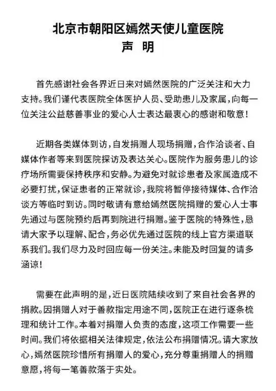 嫣然天使儿童医院也发布了最新的消息:医院方面服务患儿,诊疗场所需要保持秩序与安静,希望大家不要进医院打扰医护人员与患者。