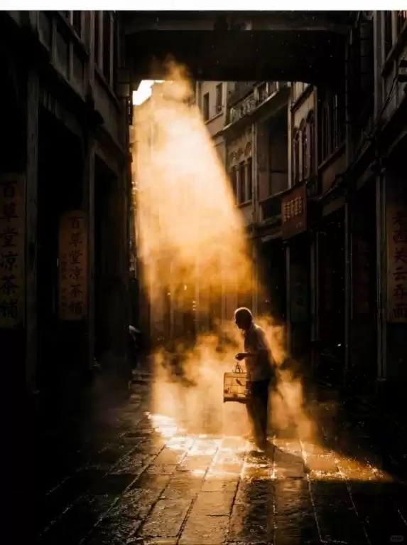 结果公示初期,大家都被这张老照片特有的质感打动了。暖黄色的色调营造出怀旧的氛围、构图稳重,楼房阴影处泄露的光线在老旧的建筑上切割出丰富的光影层次,前景的老人提着鸟笼,似乎正在诉说着老街的闲适。