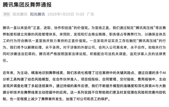 1月23日,腾讯发布2025年反舞弊通报。腾讯表示,2025年全年,腾讯反舞弊调查部共发现并查处触犯“腾讯高压线”案件七十余起,九十余人因触犯“腾讯高压线”被解聘,其中二十余人因涉嫌犯罪被移送公安机关处理,三十余名涉案的外部人员也被公安机关一并抓捕。