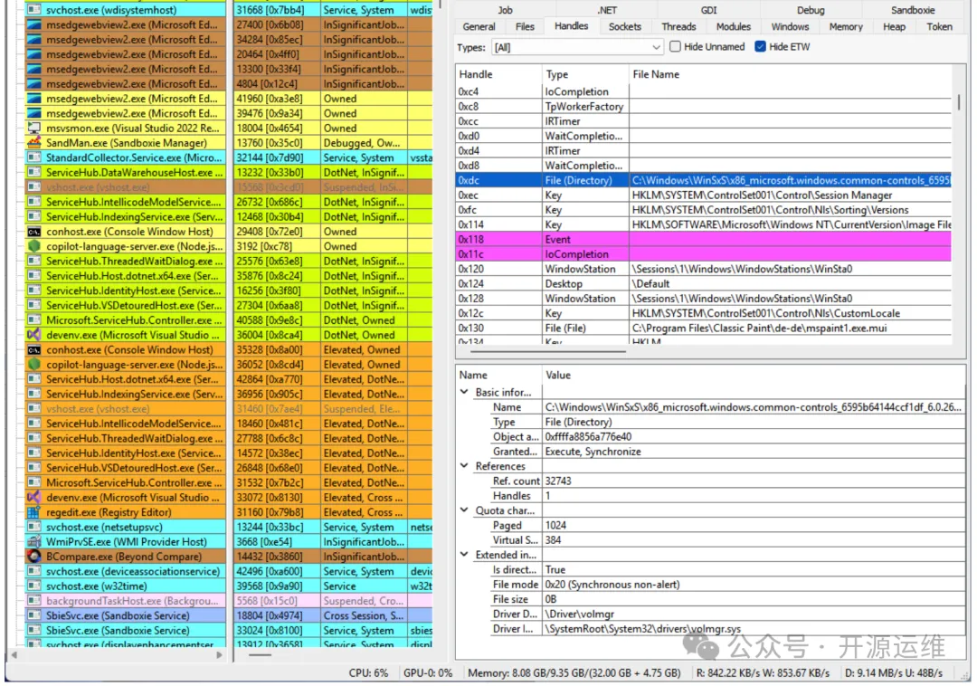 清晰列出进程打开的所有句柄,包括文件、注册表键、事件等。对于文件句柄,会显示完整的路径、当前文件指针和文件大小,让你轻松发现程序正在读写哪些敏感文件,监控其磁盘活动。