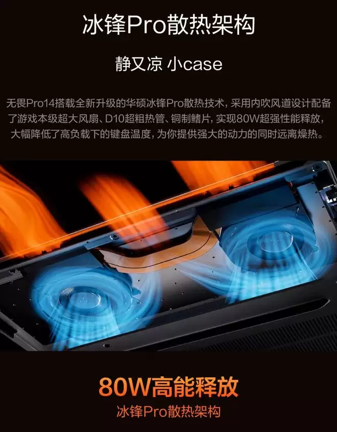 华硕无畏 Pro14/16 锐龙版搭载的新一代冰锋 Pro 散热架构,采用内吹风道设计,配备双 75mm 超大风扇和 D10 粗热管、铜制鳍片,实现了高达 80W 的整机性能释放,充分发挥处理器的应有实力,散热更快更凉快。系统内置 3 档散热模式,用户可根据实际场景需求,通过 Fn + F 组合键快速切换,兼顾持续满血发挥和静音长续航表现。