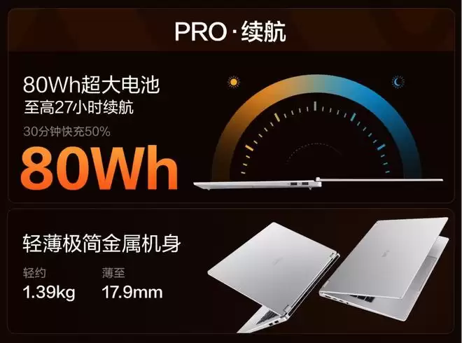 轻薄机身下隐藏的不仅是出色性能和散热表现,还有 80Wh 大容量电池,至高可达 27 小时续航,并配备快充技术,30 分钟充电 50%,外出不带充电器也能妥妥用一整天。