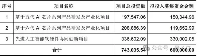 15.03亿元:第五代AI芯片系列产品的研发及产业化项目11.96亿元:第六代AI芯片系列产品的研发及产业化项目33亿元:先进人工智能软硬件协同创新项目