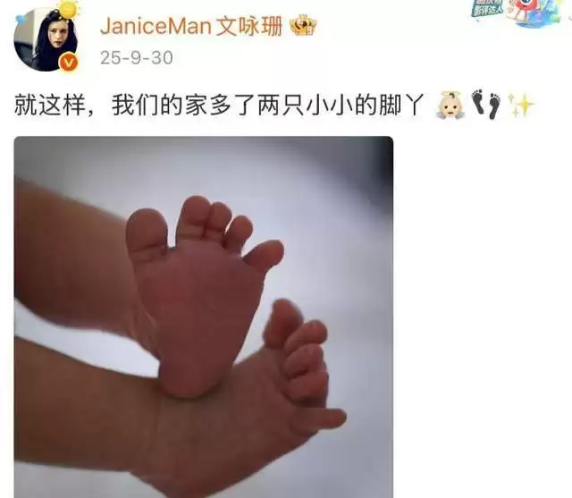 而说到文咏珊的宝宝,官宣时只晒出孩子小脚丫照片的她并未透露性别,不过,有细心的网友注意到她在文案中使用的表情包是小男孩表情,由此推测,文咏珊生的应该是个儿子。