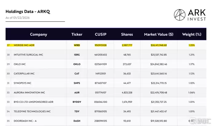 据公开消息显示,知名投资人凯西·伍德(Cathie Wood)旗下的ARK Invest自2025年12月起,持续增持自动驾驶科技公司文远知行WeRide的股份。根据ARK Invest公开披露的信息,截至2026年1月22日,其旗下的Autonomous Technology & Robotics ETF已累计持有文远知行近300万份ADR,对应市值约3000万美元;从持仓股数来看,文远知行已跻身该基金所有投资标的的前五名。