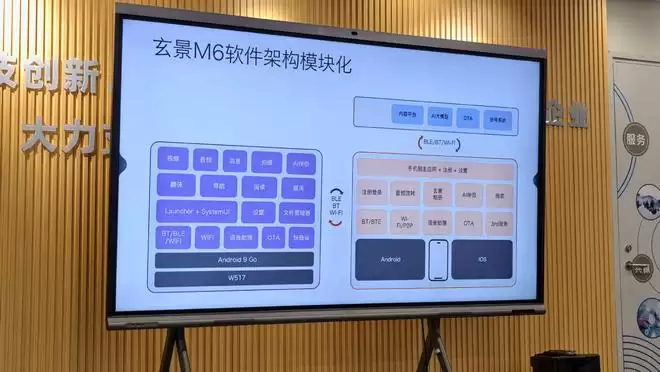 具体来看玄景M6的软件架构,其眼镜端搭载了W517芯片平台,运行Android 9 Go系统。
