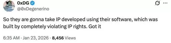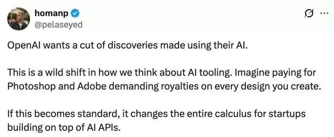 有人认为,这可能是对 AI 工具化认知的一次巨大颠覆。想象一下,如果你在使用 Photoshop,而 Adobe 却要求对你创作的每一件设计作品抽成。