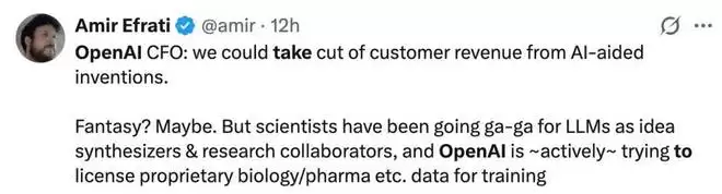这意味着,OpenAI 可能正在考虑从「卖工具」转向「分利润」的商业模式。OpenAI 似乎不满足于只收「软件使用费」,而是想在客户发财时「抽成」。