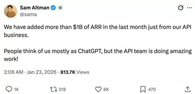 今天一早,OpenAI CEO 奥特曼就发推晒收入,「仅我们的 API 业务而言,上个月就增加了超过 10 亿美元的 ARR(年度经常性收入)。」