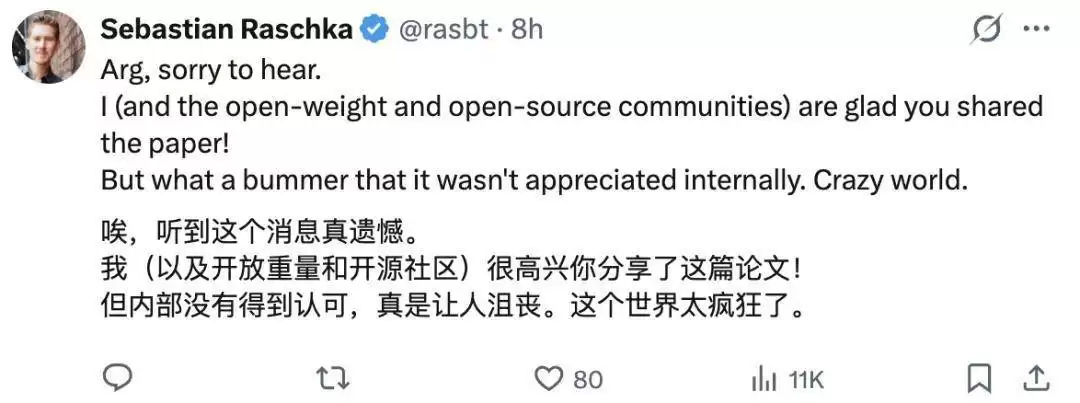 在她宣布离职的推文下,我们看到了熟悉的身影。Sebastian Raschka对她的离职表达了惋惜: