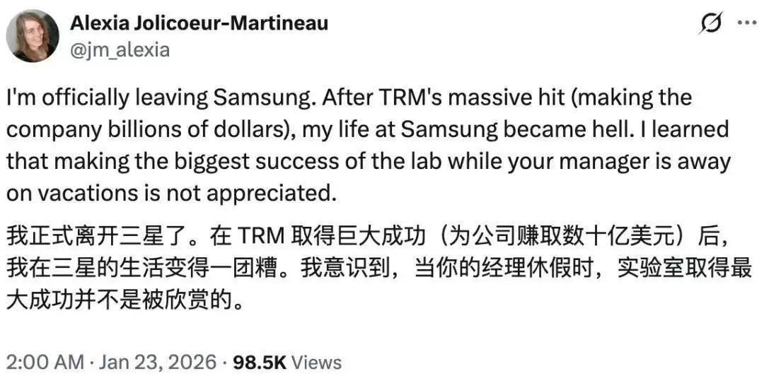 三星TRM爆火算法作者疑遭强迫离职,内部否认