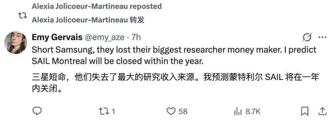 按理说,这项成果的唯一作者Alexia Jolicoeur-Martineau,本应在三星扶摇直上,带领全新团队继续后续研究,利用TRM的后续研究助力三星在人工智能领域的进步。