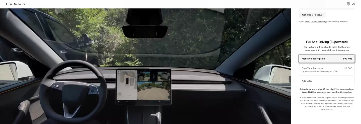 当前,特斯拉美国官网显示,用户在下单新车时,可以限时以8000美元(约合人民币55839元)的价格买断FSD功能,或选择每月支付99美元(约合人民币691元)订阅FSD服务。