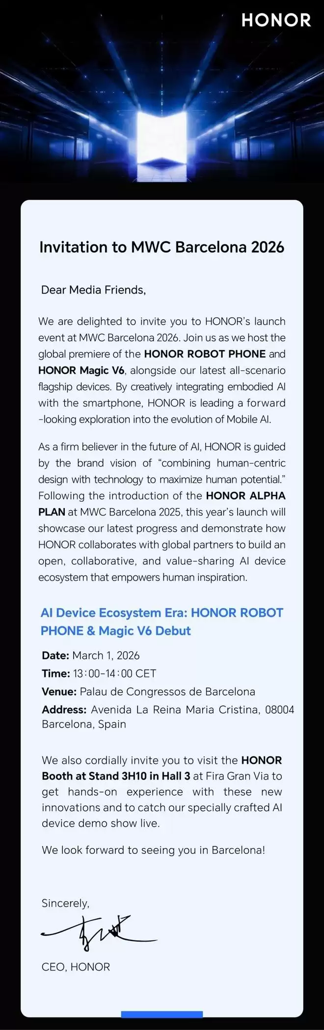 但近期荣耀官方放出了MWC 2026的邀请函,Magic V6定档3月1日巴塞罗那发布,这可不是一次常规更新。