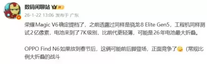 据了解,荣耀这次直接把发布节奏提前了一个季度,目的很明确,那就是要赶在春节后,正面硬刚同样搭载骁龙8 Elite Gen5(第五代骁龙8至尊版)的OPPO Find N6。