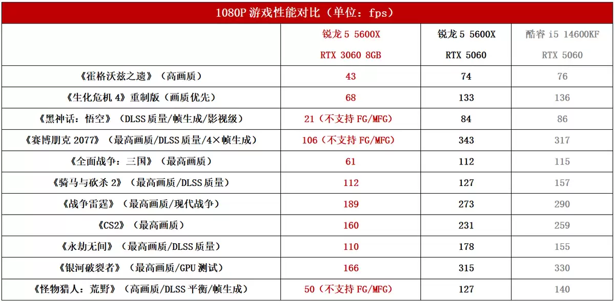 如果我们把显卡换成现在主流的RTX 5060,那么可以看到在更高级的架构和帧生成技术加持下,RTX 5060的游戏帧率表现高出一大截,一些游戏还有超出一倍甚至几倍的提升。当然,RTX 5060现在都已经涨到三千元出头了,五千元预算装机恐怕拿不下来,受不了RTX 3060 8GB的玩家只能加钱。