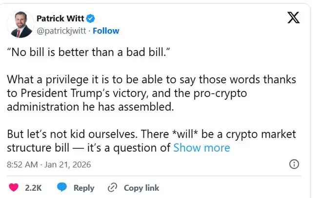 在Coinbase首席执行官Brian Armstrong帮助拖延了美国参议院关于加密货币的全面立法一周后,白宫加密顾问Patrick Witt通过X社交平台表达了他针对Armstrong的不同意见,Armstrong曾警告声称“没有法案比一个过于糟糕的法案更好”。Witt在推文中写道:“你可能不喜欢CLARITY法案《CLARITY Act》的每一部分,但我可以保证,你会更讨厌未来民主党版本的法案。”