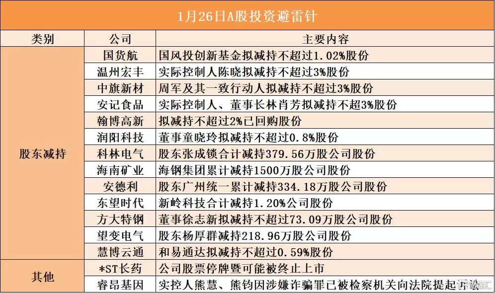 国资航空股东国风投创基金计划减持不超过1.02%股份;温州宏丰实际控制人陈晓拟减持不超过3%股份;中旗新材股东周军及其一致行动人拟减持不超过3%股份;安德利食品实际控制人、董事长林肖芳拟减持不超过3%股份;翰博高新拟减持不超过2%已回购股份;润阳科技董事童晓玲拟减持不超过0.8%股份;科林电气股东张成锁合计减持379.56万股公司股份;安德利股东广州统一累计减持334.18万股公司股份;方大特钢董事徐志新拟减持不超过73.09万股公司股份;望变电气股东杨厚群减持218.96万股公司股份;*ST长药公司股票停牌暨可能被终止上市;睿昂基因实控人熊慧、熊钧因涉嫌诈骗罪已被检察机关向法院提起诉讼