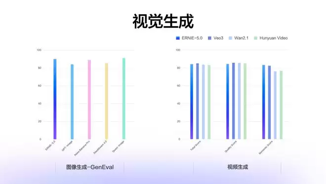 在40余项权威基准的综合评测中,文心5.0正式版的语言与多模态理解能力稳居国际第一梯队。音频和视觉生成能力与垂直领域专精模型相当,整体处于全球领先水平。