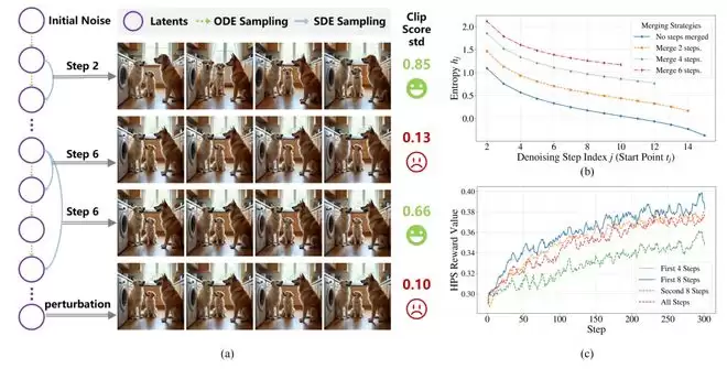 这种合并策略不仅大幅减少了无效计算,还通过扩大单一步骤的探索范围提升了熵值,同时避免了多步 SDE 采样带来的累积随机性,让奖励信号能够精准归因到有价值的探索步骤上。