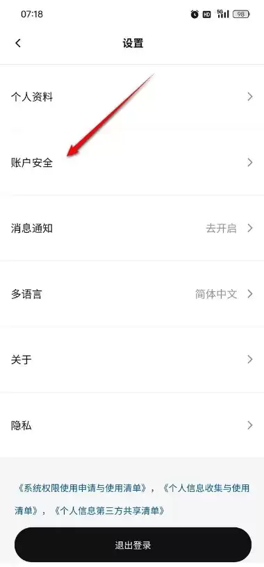 第二步,在设置菜单中,选择“账户安全”这一项。