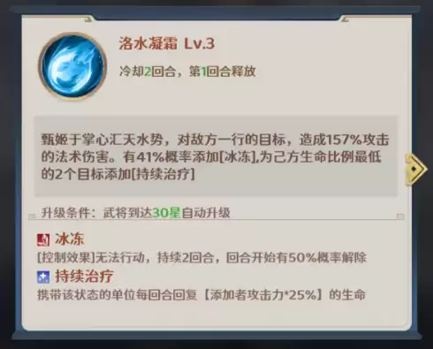 目前使用甄姬,她的另一个称号是“洛水佳人”。放置在辅助位置上时,其核心技能“洛水凝霜”可以对敌方单行目标发起攻击,造成157%的基础法术伤害。此技能有41%的概率为目标附加冰冻效果,成功冰冻后能使敌人在一段时间内无法行动。需要注意的是,回合开始时,有50%的概率解除该冰冻效果,因此需要快速叠加控制效果。当“洛水凝霜”成功触发冰冻后,还能为我方生命值比例最低的队友提供持续的恢复效果,且该治疗效果可以同时作用于两名队友。通常,携带此状态的队友,每回合均可恢复等同于甄姬攻击力25%的生命值。这意味着,甄姬的攻击力越高,为队友带来的生命恢复也就越可观。