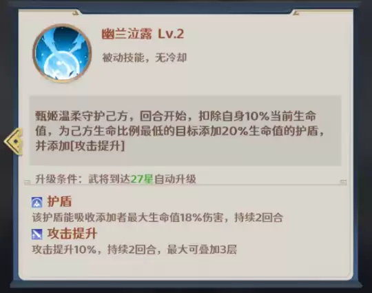 甄姬的最后一个技能“幽兰泣露”是一个被动效果,它会在回合开始时扣除甄姬当前生命值的10%,随后为我方生命值最低的一个角色提供一个相当于其生命上限20%的护盾。使用这个技能时,首先要确保甄姬在扣除10%生命后自身安全无忧。若我方生命值最低的角色是核心输出,那么使用此技能的性价比最高。为该角色添加护盾的同时,还能带来可观的攻击力提升。通常在需要最后一击时,利用此技能可以力挽狂澜。技能提供的护盾可以吸收相当于甄姬最大生命值18%的伤害,而攻击力提升的百分比为10%,最高可叠加三层,带来30%的伤害提升。这使其具备了作为收割手段的能力。