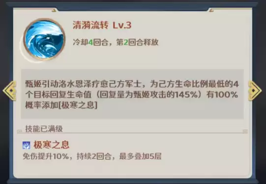 甄姬冷却时间最长的技能是“清溟流转”。此技能可以根据当前治疗效果,为我方生命值最低的四名目标进行群体恢复。选中的四名队友,将恢复等同于甄姬攻击力145%的生命值,并有100%概率为其中一名队友附加“极寒之息”状态。此状态能为队友提供免伤效果,提升10%的免伤率,并且可以累计叠加5层。这种效果等同于变相提升了我方队伍的生存能力。此外,她的群体恢复百分比也相当高,可以看作是一个强大的群体治疗技能。