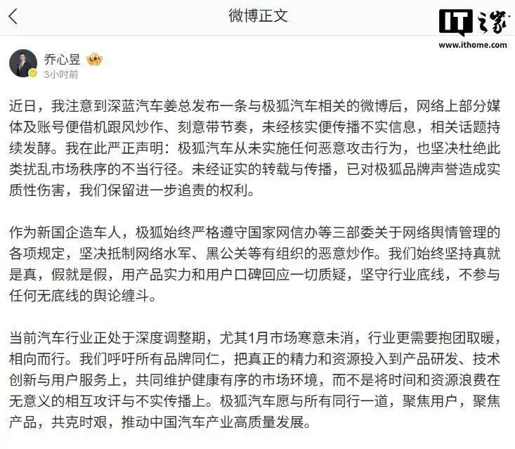 北汽极狐乔心昱回应舆论,倡议共建行业健康新生态
