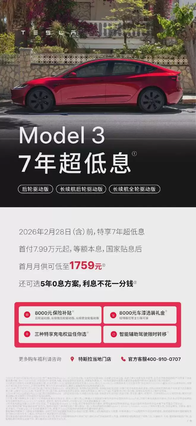 【特斯拉:购Model 3部分车型享8000元限时保险补贴】1月24日消息,特斯拉发布最新购车优惠方案。2026年1月24日至2月28日订购现款Model 3后驱驱动版/长续航后轮驱动版/长续航全轮驱动版可享限时8000元保险补贴。(财联社)