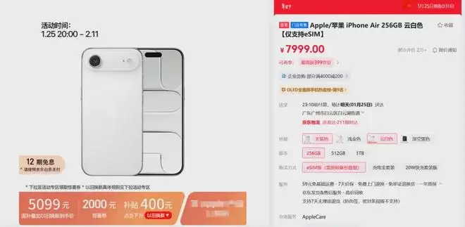 【iPhone Air三个月暴跌近3000元】1月23日晚,苹果最新旗舰店开启了iPhone Air优惠活动,最新立减2000元,叠加国补到手价5499元起。而在第三方电商平台上,iPhone Air的价格也进一步走低,在增加以旧换新补贴后,到手价为5099元左右。iPhone Air国行版于2025年10月22日开售,如今刚刚上市三个月整,其最新价格为7999元起,这也意味着其全新机的价格三个月下跌了2900元。iPhone Air是去年9月份苹果秋季发布会上全新推出的机型,走的超轻薄路线。采用内置eSIM技术,没有实体SIM卡槽,重量仅165克,厚度仅5.6毫米,是苹果迄今最薄iPhone。(新浪财经)