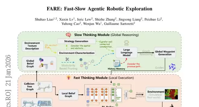 研究团队开发的FARE系统(Fast-slow Agentic Robotic Exploration)就像给机器人装上了这样一套"人类探索思维"。这套系统的核心理念是将机器人的探索过程分为两个层次:一个负责全局规划的"慢思考"模块和一个负责局部执行的"快思考"模块。这种设计让机器人既能像经验丰富的探险家一样制定宏观策略,又能像敏捷的登山者一样应对眼前的具体挑战。