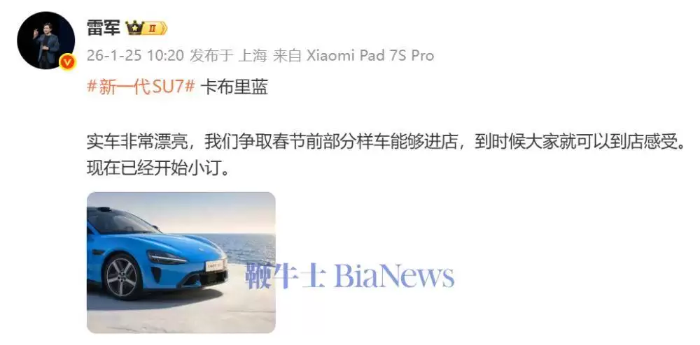 雷军:新一代SU7卡布里蓝实车惊艳,春节前样车将亮相