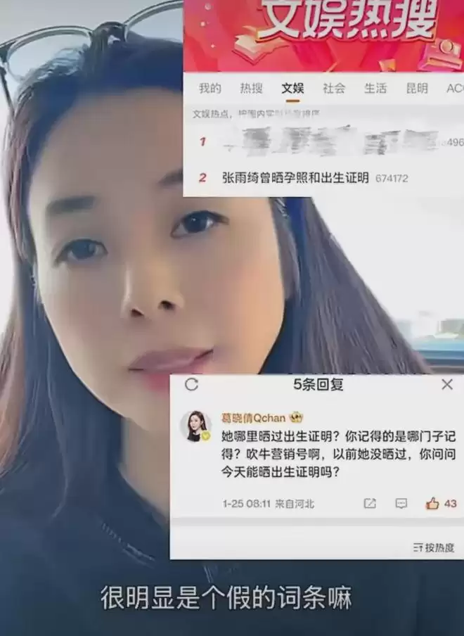 张雨绮因录制辽宁卫视春晚遭到抵制,前夫袁巴元的前妻葛晓倩二度曝光其“小三、代孕、疑找律师威胁”等争议,张雨绮遭到舆论谴责。而后,“张雨绮曾晒孕照和出生证明”的热搜飙升至排行榜第二,葛晓倩也立即下场打假。