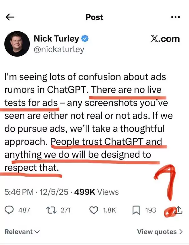 而OpenAI的承诺「回复不会受到广告影响」,用户别无选择,无法验证。