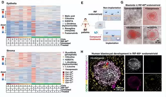 值得关注的是,研究人员采用经过伦理审批后的科研捐赠的人类真实胚胎,验证了化合物处理后可提升了 RIF 的植入率。经阿伏苯宗处理后,人类胚胎可在 RIF-60 号患者子宫内膜样细胞中发育至植入后早期阶段。
