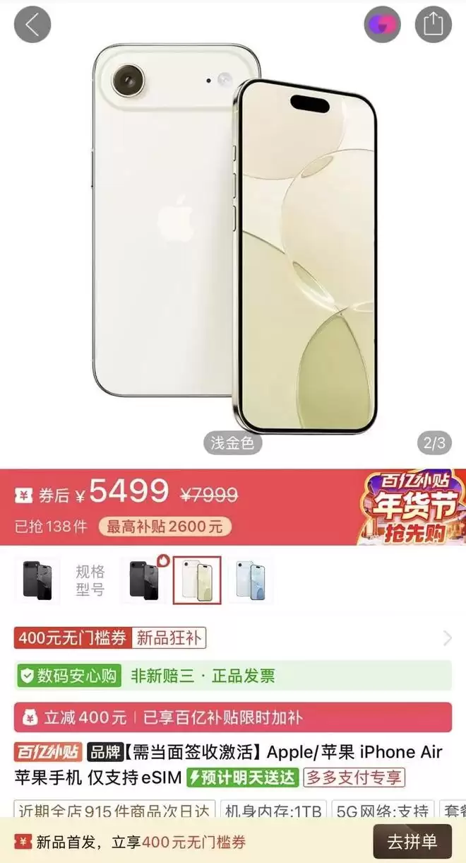 值得注意的是,拼多多百亿补贴的参战,似乎预示着 iPhone Air在第三方渠道后续将维持在 5000 元价位档、甚至被打到更低。