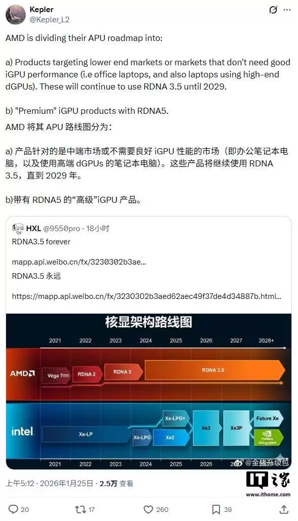@9550pro 随后将其搬运到了X平台,接着另一位爆料者@Kepler_L2 指出了图中一处不准确的地方,并对AMD未来APU产品线中集成显卡的架构规划提供了更细致的解读。