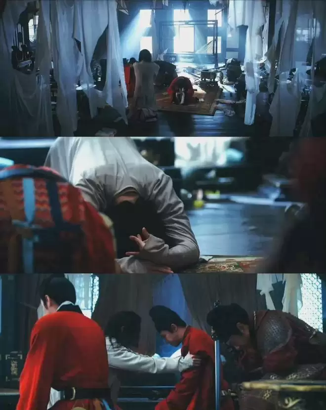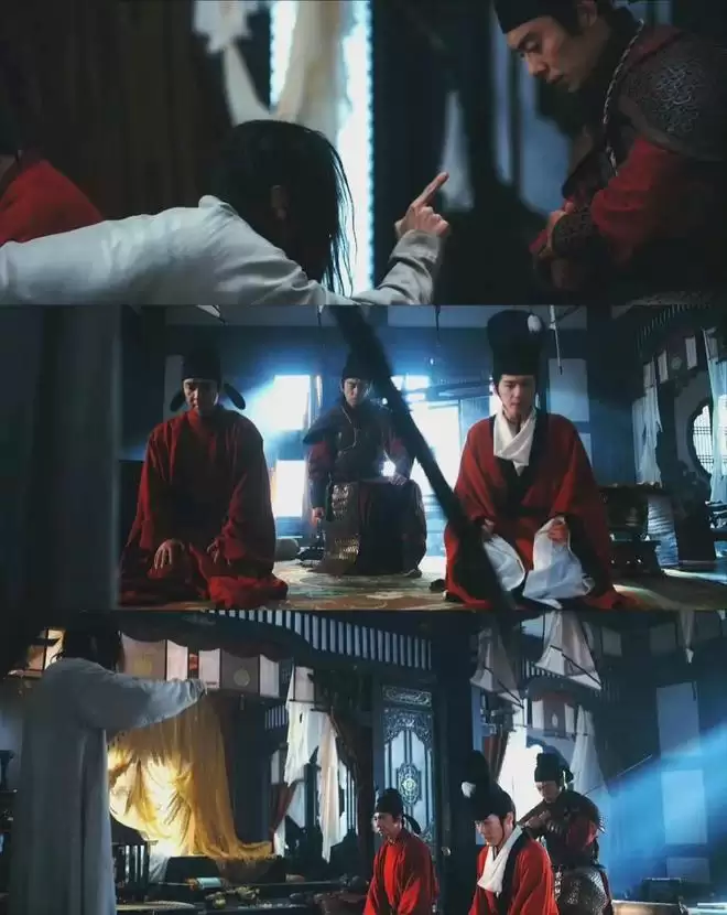 这个名场面的妙处,藏在每一处细节里。镜头语言堪称封神,血色浸染的朝堂上,破碎的冕旒散落在地,昔日高高在上的天子俯身跪拜,龙袍褶皱里全是旧秩序崩塌的狼狈。