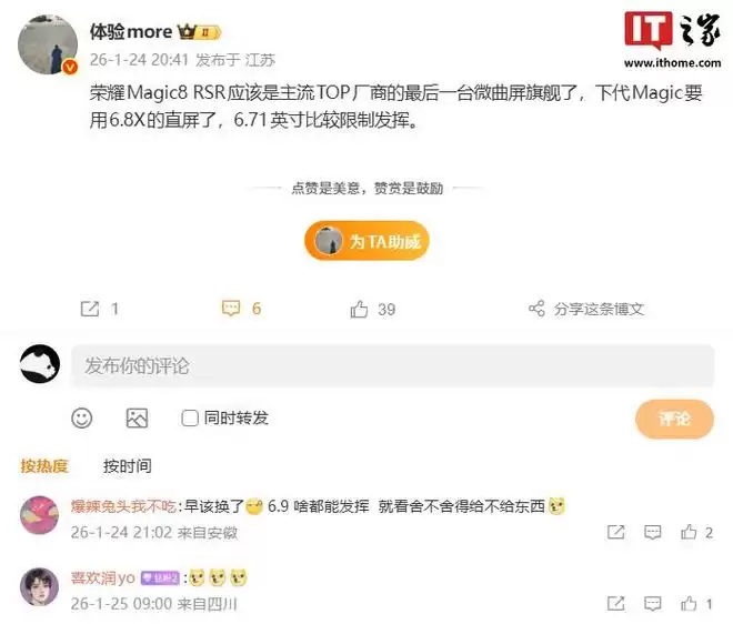 IT之家1月25日报道,据博主@体验more昨日透露,荣耀Magic8 RSR很可能是主流顶级厂商的最后一款微曲屏旗舰。他表示,下一代Magic系列将采用6.8英寸的直屏设计,而6.71英寸的屏幕会限制其发挥空间。