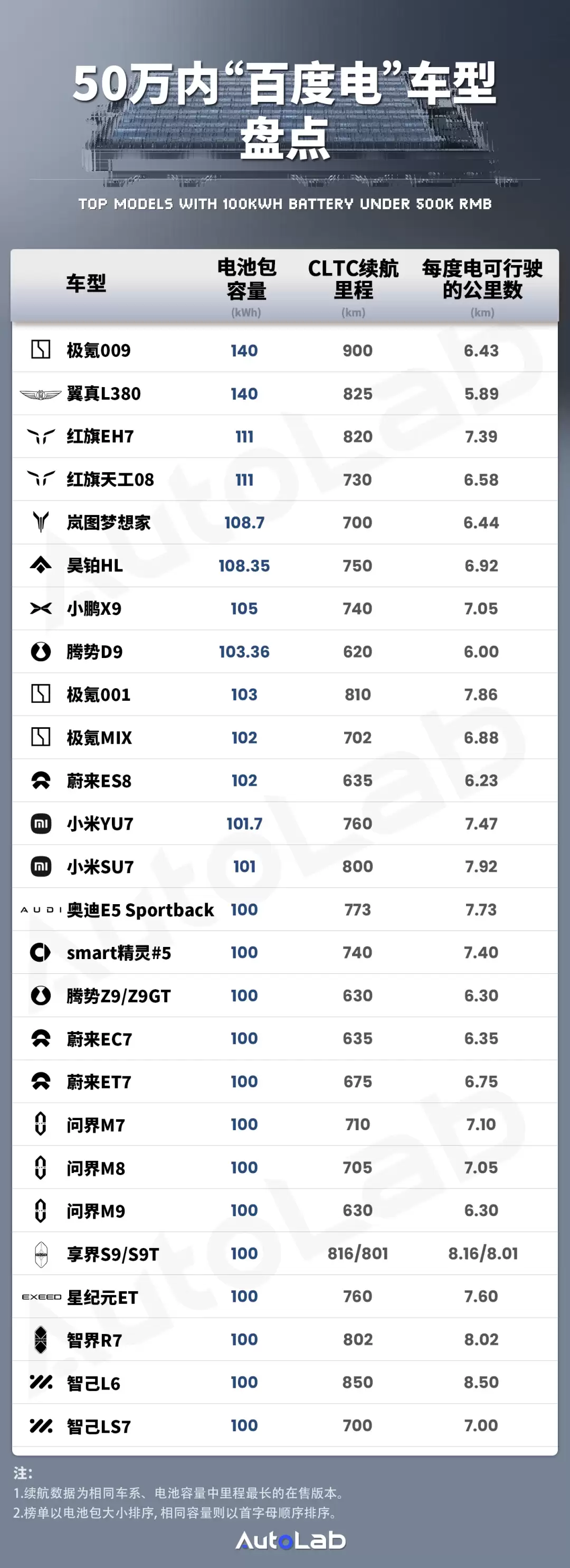 为了更直观地比较不同车型的能耗表现,我们梳理了市面上售价50万元以内、电池包容量≥100度的主流车型,并采用“每度电可行驶里程”(CLTC续航÷电池包容量)作为统一指标。需要说明的是,该数据基于申报标准计算,非实际测试结果,仅供横向对比参考。