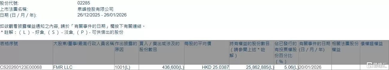格隆汇1月26日|根据联交所最新权益披露资料显示,2026年1月20日,泉峰控股(02285.HK)获FMR LLC在场内以每股均价25.0387港元增持43.66万股,涉资约1093.2万港元。
