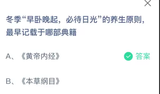关于冬季“早卧晚起,必待日光”的养生原则,最早出自哪部古代典籍呢?支付宝小鸡课堂今天开课啦!每天花上一分钟参与答题,赚取饲料喂养小鸡,还能顺手贡献一份爱心,轻松又有意义!2026年1月26日蚂蚁庄园小鸡课堂题目的正确答案是【《黄帝内经》】。冬季“早卧晚起,必待日光”的养生原则,最早记载于《黄帝内经》。