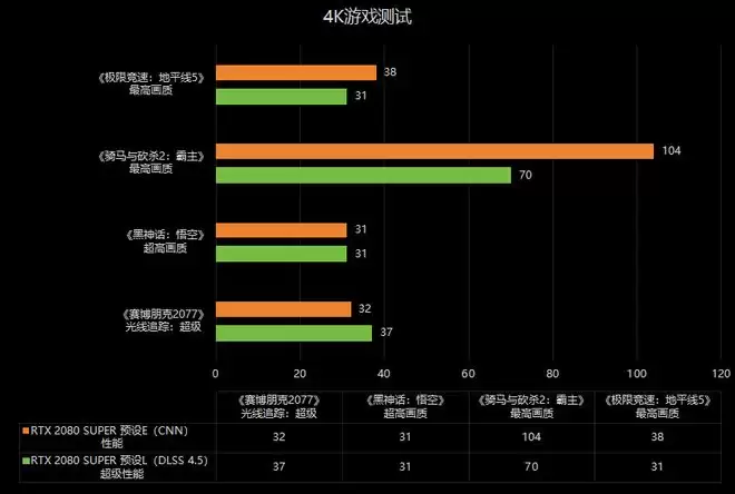4K分辨率我们只测试了RTX 2080 SUPER显卡,在《赛博朋克2077》中,DLSS 4.5的帧率比CNN模型高约16%,《黑神话:悟空》和CNN模型持平。另外两款游戏的平均帧率分别下降了约33%和18%。