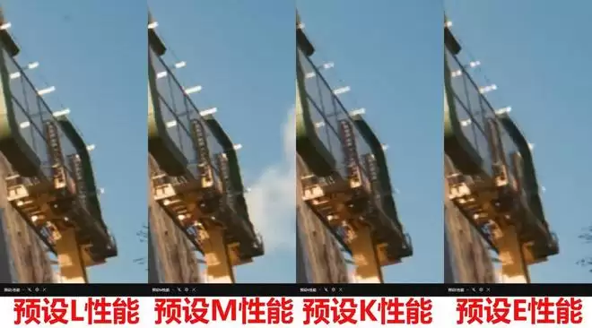 可以看到,三代超分辨模型之间在画质上的确有不小的区别。第二代Transformer模型的细节和清晰度最好,能够保留更多的画面细节和纹理,室内的安全出口标志、远处的广告牌、文字等都有着很好的细节表现,其中L预设即使是超级性能的画面都十分接近一代Transformer模型的性能预设;第一代Transformer模型次之,细节表现不错和新模式的差距主要在锐度上;CNN模型的画面最模糊,并且存在明显的细节缺失,远景只能看出个轮廓没有细节。